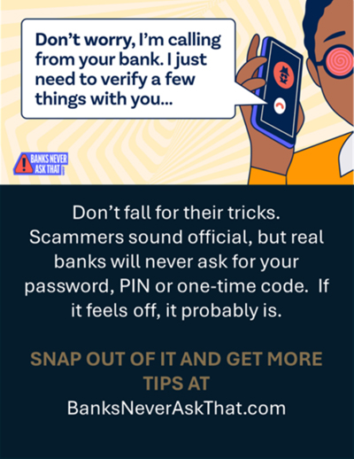 October kicks off the annual “Banks Never Ask That” Campaign through the American Banker’s Association which focuses on educating customers about fraud prevention. Scammers may sound official, but real banks will never ask for your password, PIN or one-time code. If it feels off, it probably is. Get more tips at BanksNeverAskThat.com